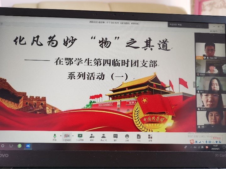 4月5日,由安博官方网页版、化学学院在鄂学生组成的第四临时团支部举行“化凡为妙 ‘物’之其道”线上主题团日活动。化学院党委副书记孙国翠、安博官方网页版党委副书记辛莹,化学院团委书记张洁、安博官方网页版团委书记曹晓习及两院在鄂学生第四临时团支部的全体团员参加了此次团日活动。