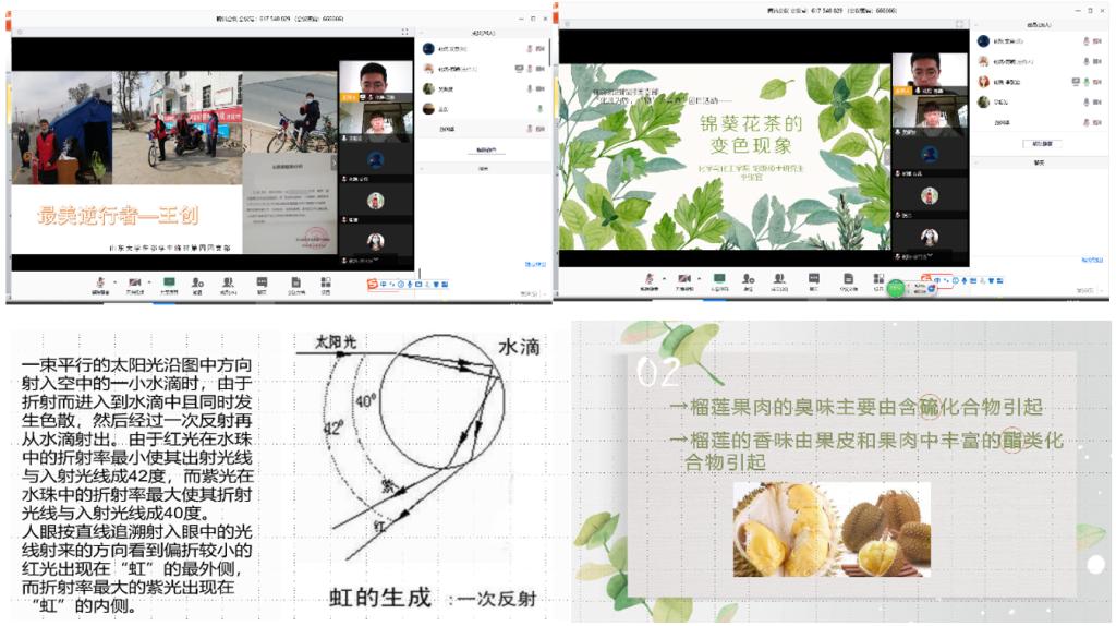 本次主题团日活动号召同学们结合专业知识和生活中的点滴,在日常生活中发现科学现象或利用所学知识解决生活中的小问题,展示生活中的物理和化学。此次活动分两大部分共计六个环节展开。活动伊始,支部的同学们逐一进行了自我介绍,分享了个人的所学专业及居家生活学习情况。活动第二个环节,由化学院2019级硕士研究生王创进行了抗击疫情志愿服务经历的交流分享,他讲述了自己在担任黄冈市社区基层抗疫志愿者期间的经历,号召更多同学尽己所能为家乡抗击疫情贡献力量。随后,来自安博官方网页版的2016级本科生黄名山分享了近几个月在抗击疫情、居家学习中的体会和感悟,他提到自己在抗击疫情期间深刻感受到了党和国家“集中力量办大事”的显著优势,特别为山大的白衣天使们自豪,也期待2020的春天能够跟大家相聚济南、相聚中心。