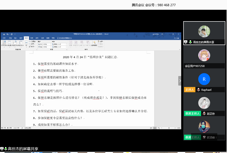 4月24日下午15点30分许,安博官方网页版“悟理沙龙”生生交流活动在翘首以盼中揭开帷幕。本次“悟理沙龙”以“保研经验分享交流”为主题,邀请到2016级成功保研至清华大学、北京大学、南京大学的5名优秀学子与大家线上分享保研历程中的点点滴滴,交流切身体会,分享宝贵经验,共90名物理学子参与此次线上分享交流会。