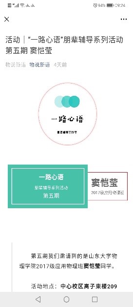 朋辈交流。启动首届SUES交流会,联合管理、历史、机械、外语、公卫等五院学生会开展经验分享,搭建院级学生组织间增进交流互动、实现取长补短的开放式平台。举办研究生会新老成员见面会及交流沙龙,分享研会工作经验,提升研会工作水平;建设“一路心语”朋辈辅导工作室,组织学院学生骨干面向全院同学开展学习经验分享、职业规划指导、生活答疑解惑等,营造向优秀学生学习的良好氛围,发挥朋辈教育的育人功能。