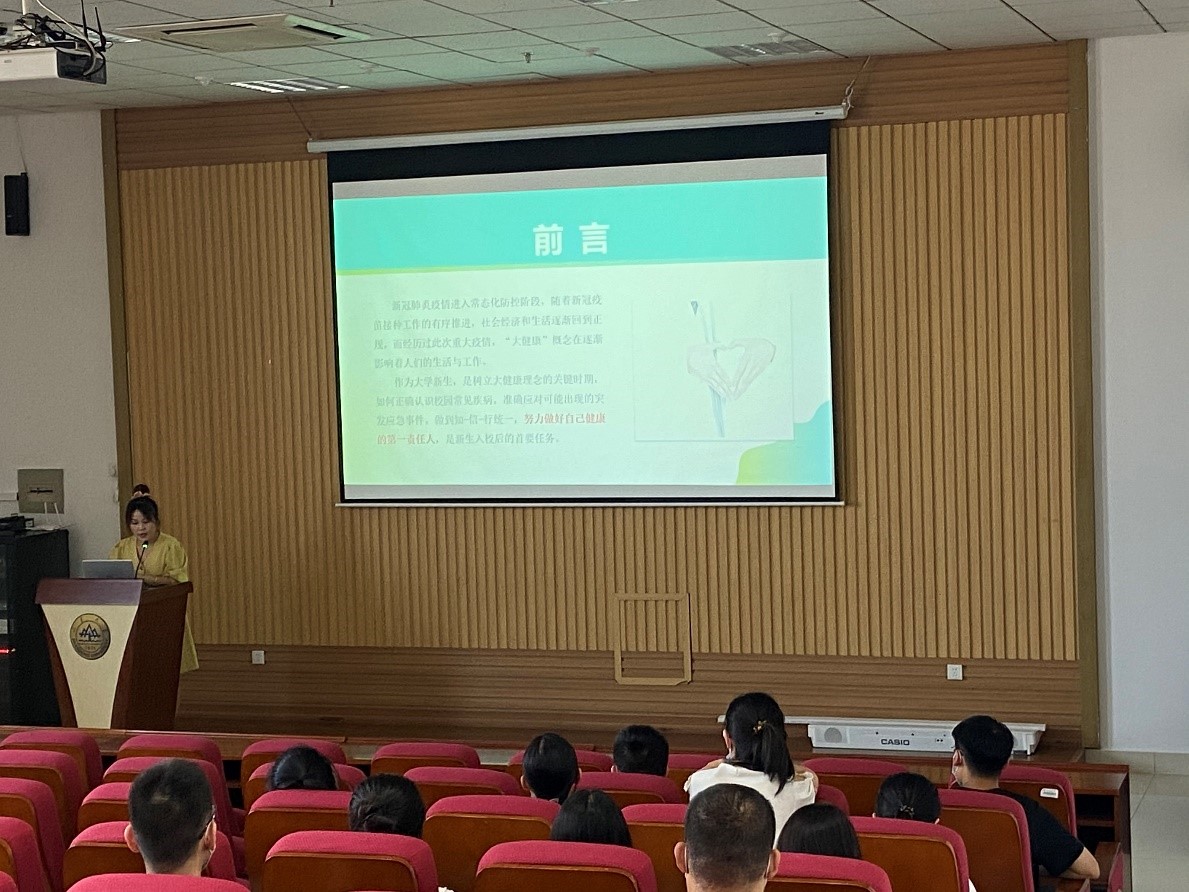 学健康知识,养强健体魄。校医院内科医生张丽莹为新生开展学校卫生健康与应急救护知识讲座,指出新冠疫情进入常态化防控阶段,“大健康”概念在逐渐影响着人们的生活和工作。张丽莹从新冠肺炎与新冠病毒疫苗、疫情常态化防控下的应急处置、校园常见传染病防控措施、近视防治与用眼卫生、意外伤害与应急救护、校园健康与就医指南等方面开展健康教育,切实增强同学们的健康防护意识。