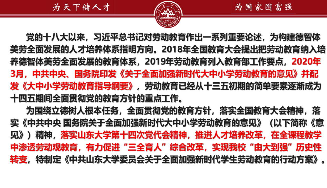 活动第二部分,曹晓习为同学们进行了《中共山东大学委员会关于全面加强新时代学生劳动教育的行动方案》的政策解读,她带领同学们了解了方案制定的背景、主要考虑,逐一梳理了方案的框架和重点内容。在此基础上,她又就学院的劳动教育方案、劳动教育清单进行了详细介绍,鼓励同学们积极参与各类劳动教育实践活动,在参与志愿服务、社会实践、专业实践、就业指导、创新创业、校园实践岗位和宿舍日常生活中培养劳动兴趣、磨练意志品质、增强社会责任感、提高实践能力,促进身心健康和全面发展。
