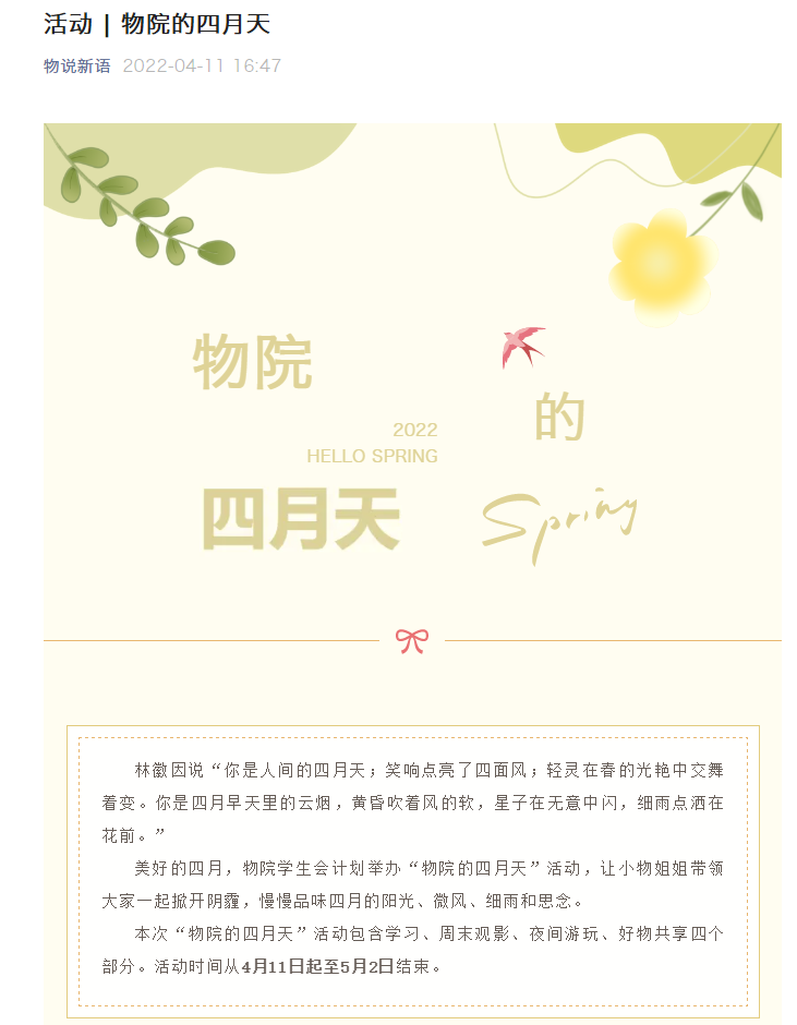 就业促进工作全员聚力。全面开展学院2022届毕业生就业促进工作,学院书记院长、分管领导、毕业班辅导员、专业教师全员动员,帮助考研学生点对点提供招录信息、考研调剂信息等,同时将学院二楼教工之家作为考研复试专用场地,全方位做好考研学生的保障工作。建立就业信息共享群,为求职学生提供点对点简历修改、行业选择、往届毕业生联络等的指导工作,每周2-3期整理发布物理学、应用物理学专业等的相关招聘信息,截止目前已累计推送64期。继续拓展学院国外/境外校友资源,为计划申请出国/出境深造学生牵线搭桥,帮助学生缓解疫情影响下的出国留学难题。
