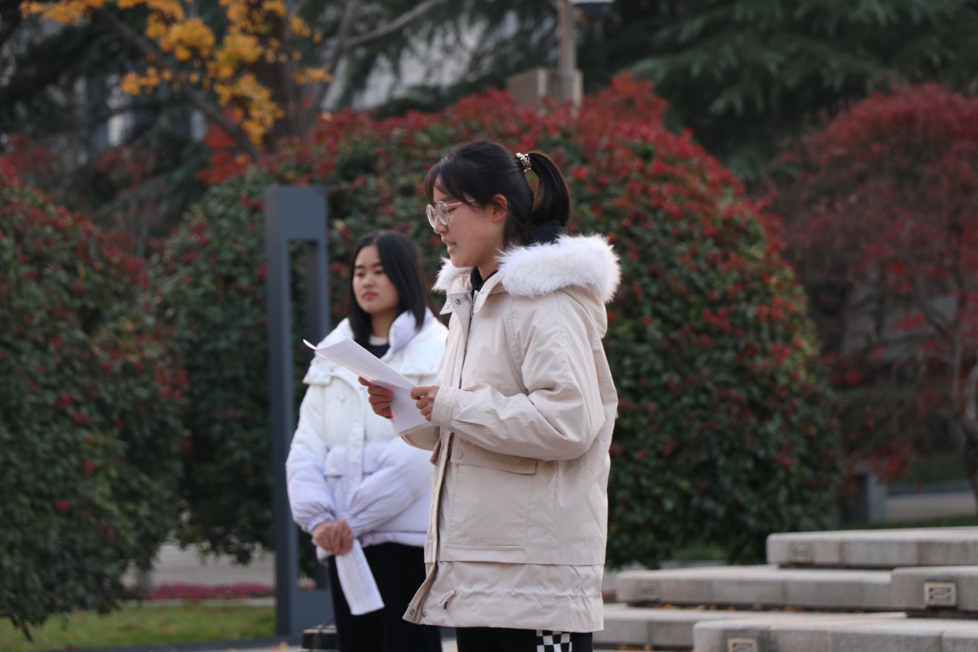 随后,在学院 2022级本科生张金鑫领誓下,全体团员青年列队整齐,高举右拳,重温入团誓词。仪式最后,活动现场团员全场一齐唱响团歌。慷慨激昂的旋律在大成广场上空久久回响,载着全体山大物理人的昂扬志气,尽情彰显团员青年奋发有为的决心!