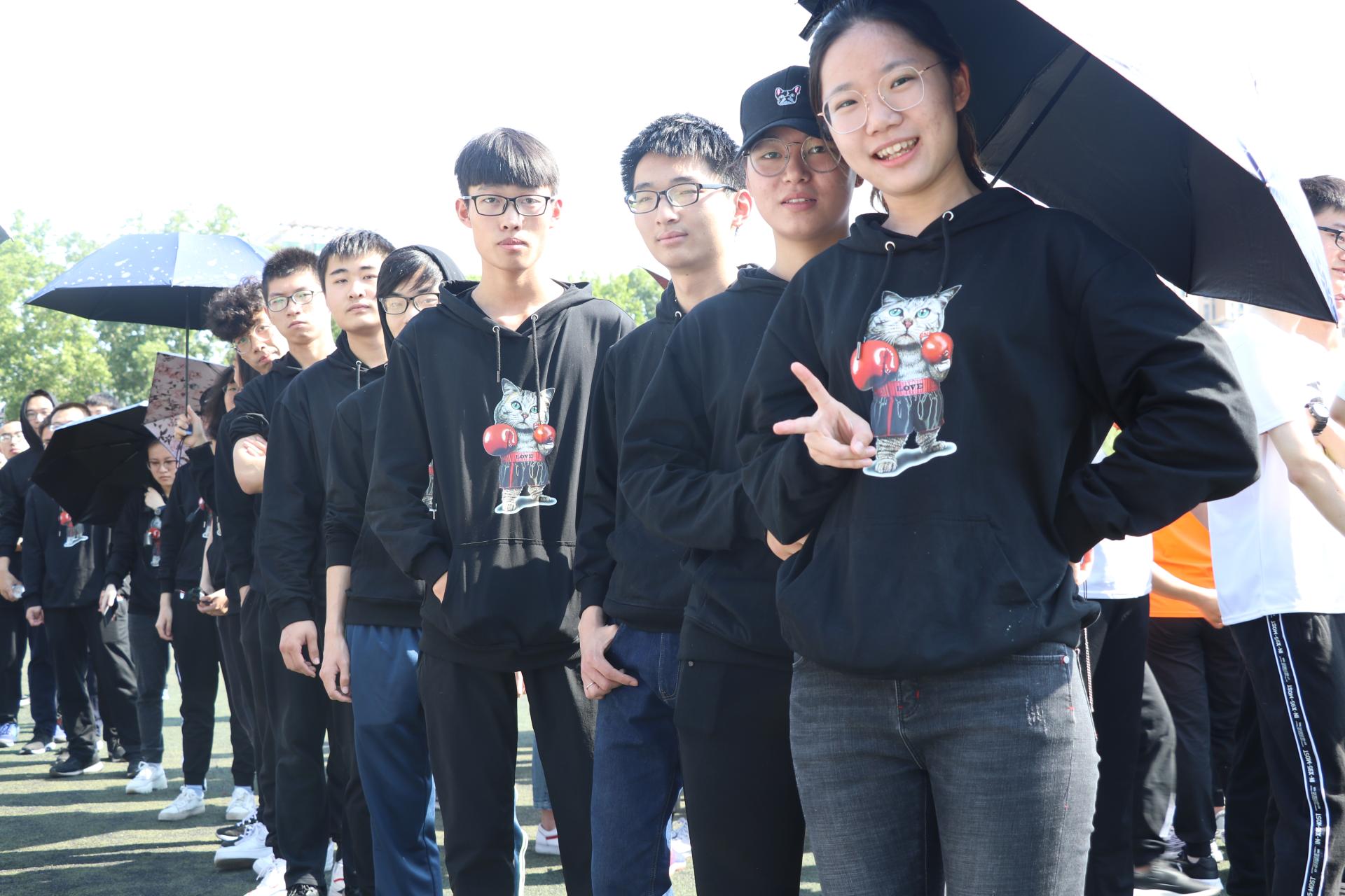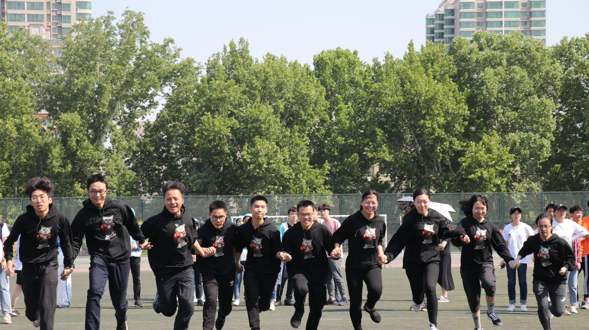 活动当天太阳毒辣,白刺刺的日光晒得队员们几乎睁不开眼睛,但同学们发扬团队精神,互相帮助,你帮我递一瓶水,我帮你揣一下手机,没有一人掉队。最热闹的,莫过于赛场上正在比赛的同学们喊着号子,迈着整齐的左右腿,把旱龙舟推过了终点线,莫过于把“正能量球”稳稳地传给了下一队,莫过于“二十人二十一足”项目中跑在了最前面。队员们有时手拉手一起冲刺,有时静下心稳稳前行。传递呼啦圈的时候,高个子的男同学贴心地扬起手帮矮个子的女同学把呼啦圈套在身上;传递能量球项目,队员们用默契的配合成为了同组唯一安全到站不落地的队伍;俄罗斯方块项目里,队员们分工明确,用最快的速度拼好了方块墙……