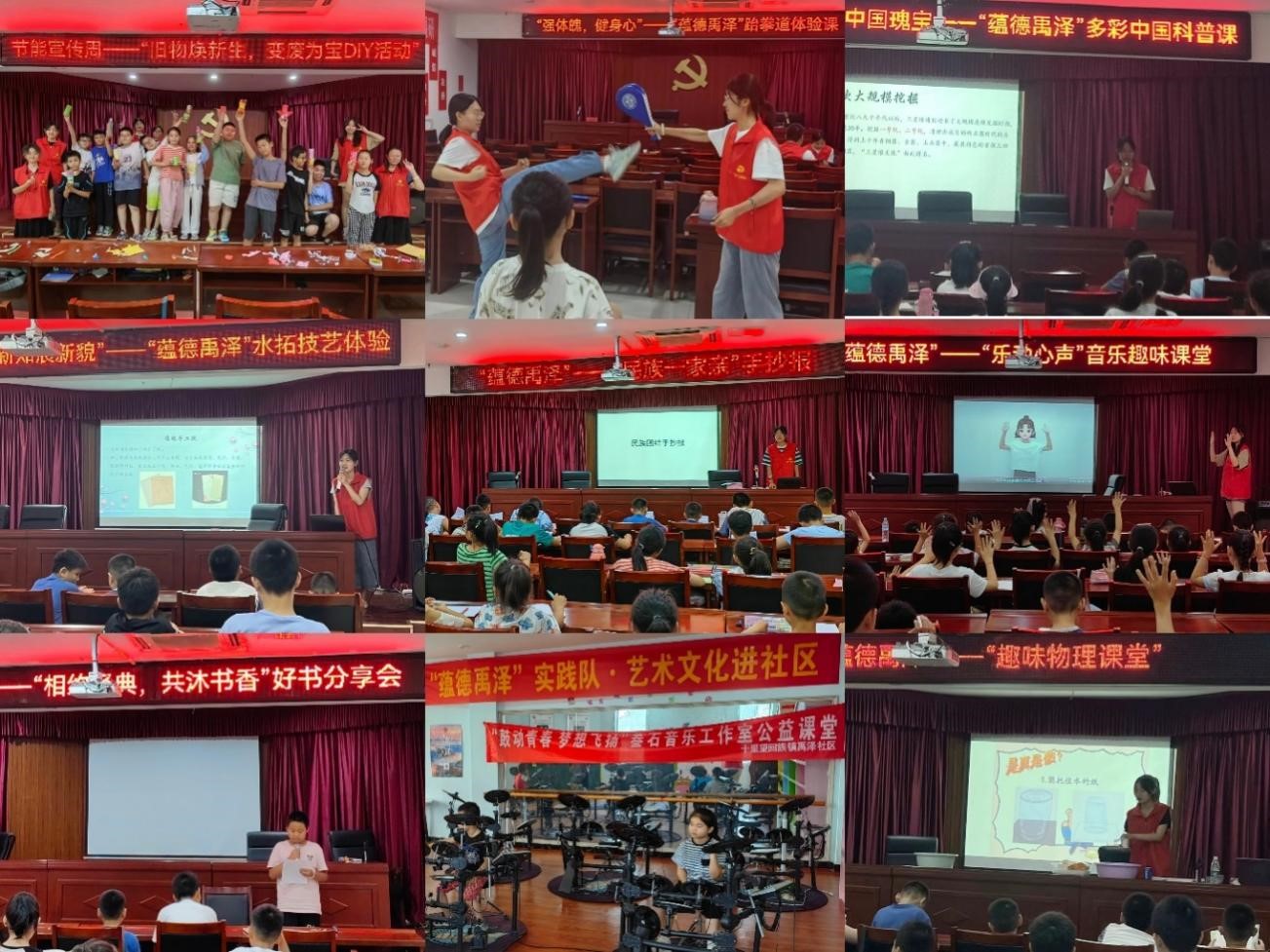 实践过程中,“蕴德禹泽”实践队结合当地社区发展需求以及实践队专业特长,开展宣讲类、志愿类、艺术类、文化类、互动类、调研类等活动,取得了优异成果。实践队通过中华民族共同体意识宣讲、禁毒知识宣讲、交通安全教育宣讲等在思想层面筑牢民族团结及安全意识;通过美化社区环境志愿服务、学业辅导志愿服务等在行动层面做好基层群众服务;通过民族茶话会、民族文化分享会、变废为宝手工DIY等在艺术层面营造浓厚氛围;通过观影活动、文艺汇演等在文化层面丰富精神生活。